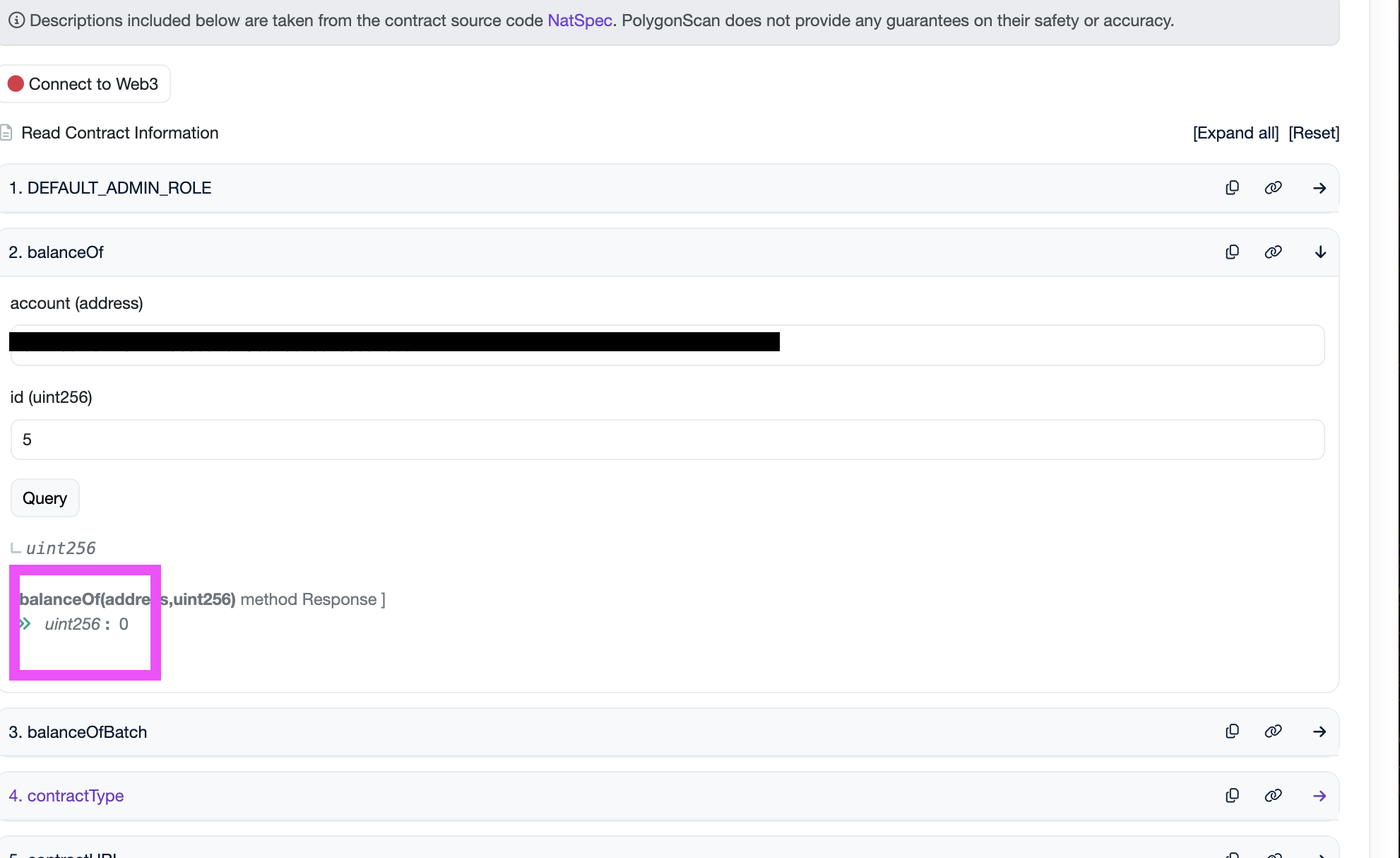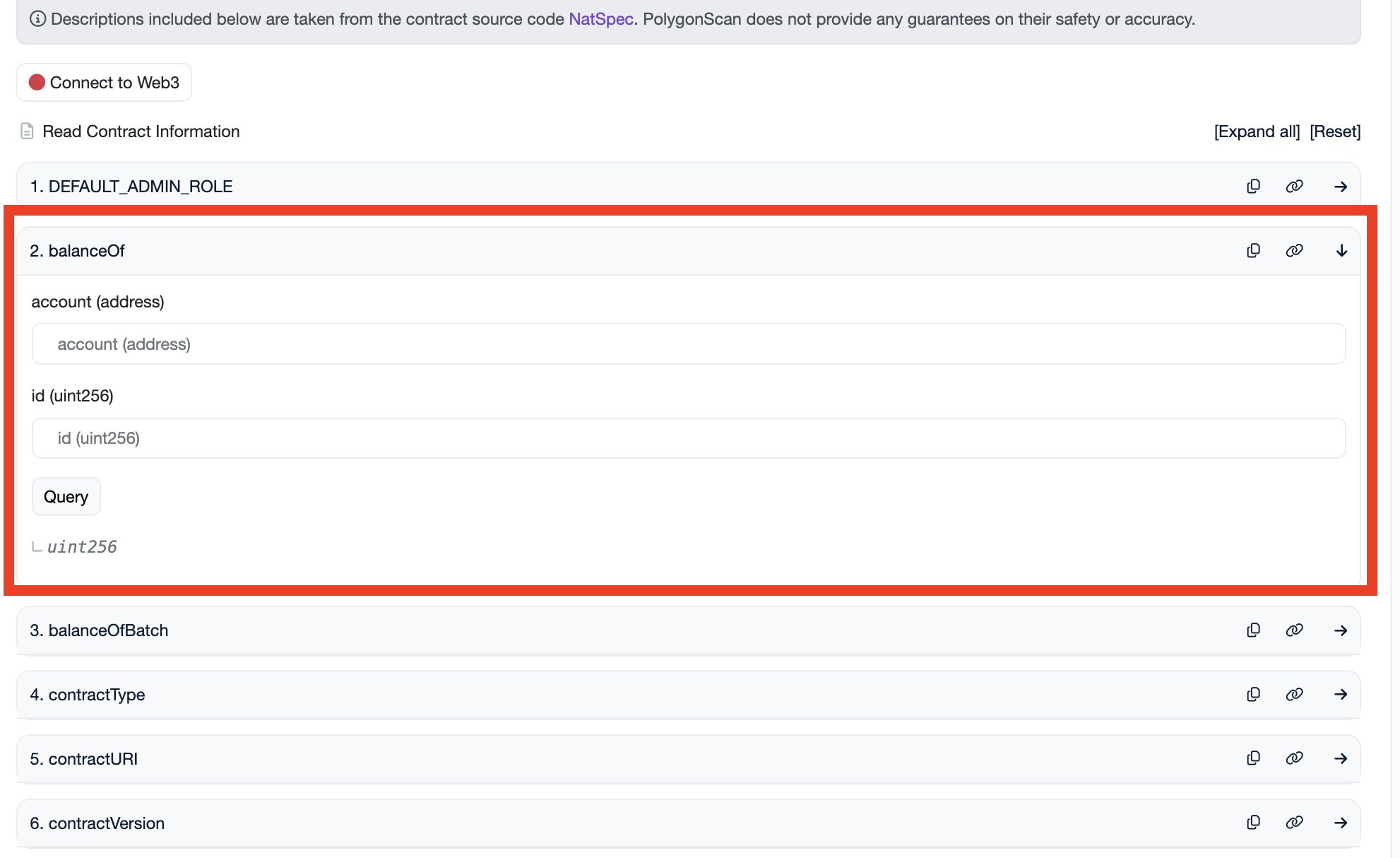 そのままスクロールし、blanceOf 部分を押すと赤枠のような部分が確認できます。