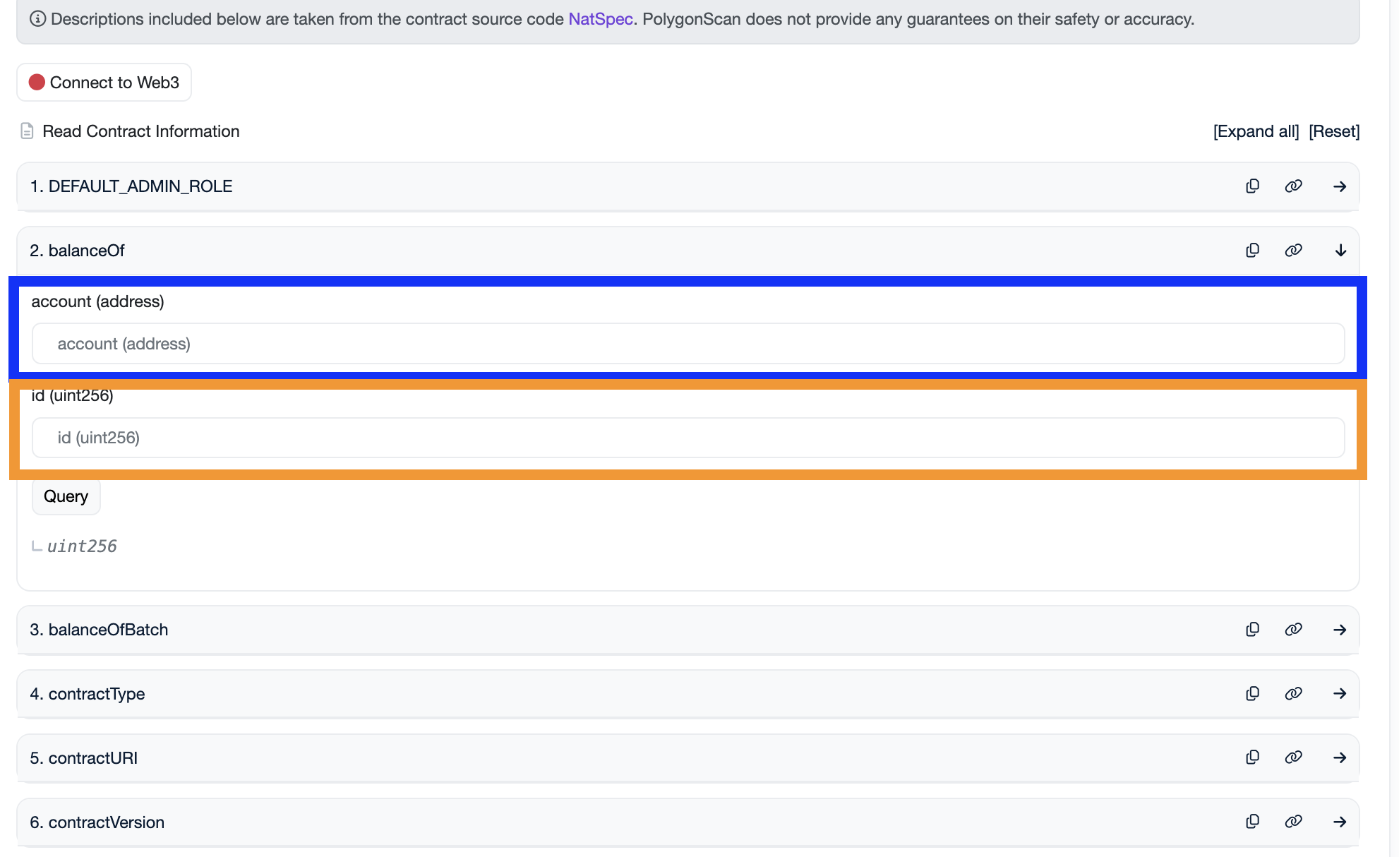 address部分(青枠部分)にご自身のウォレットアドレスをId の部分(オレンジ枠部分)にFM1をの保有数を確認したい場合は、2、FM2の保有数を確認したい場合は、3を入れてください。